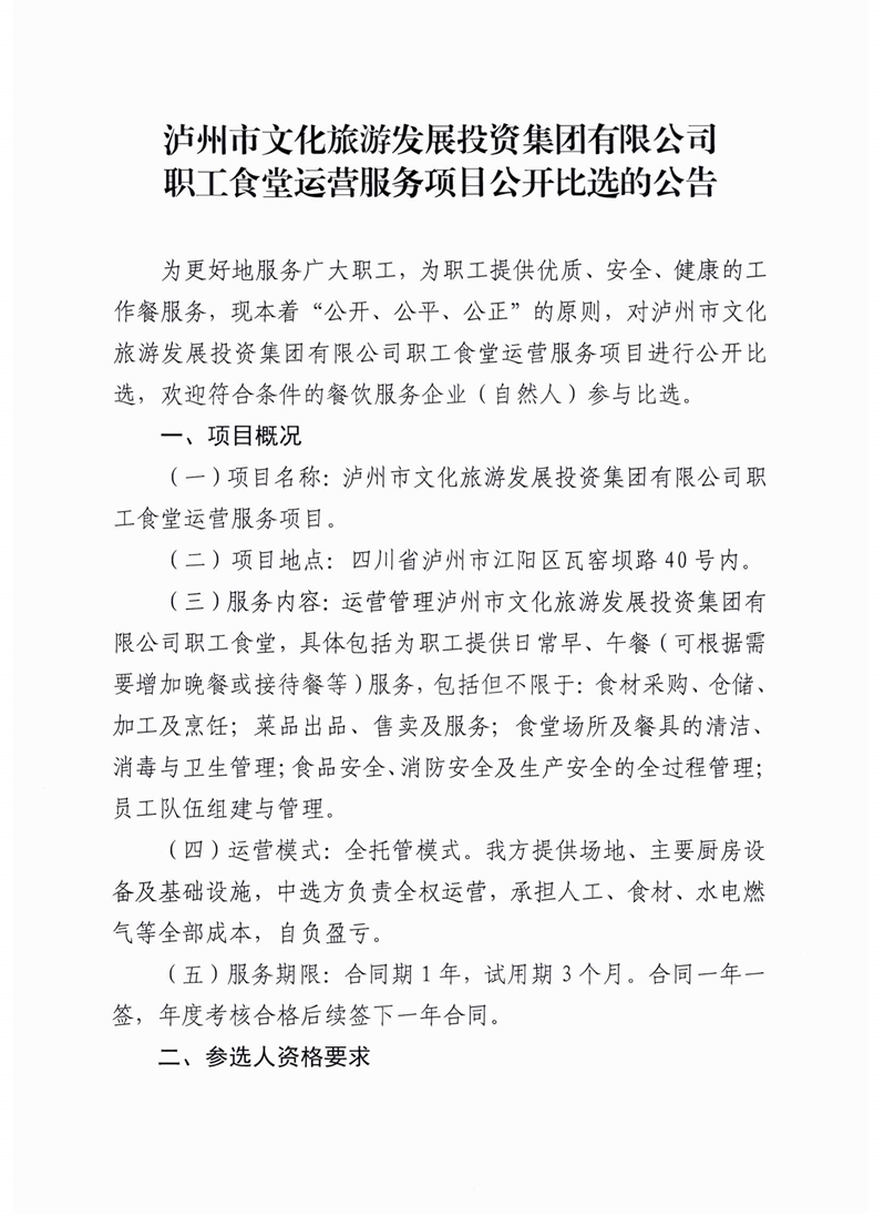 泸州市文化旅游发展投资集团有限公司职工食堂运营服务项目公开比选的公告