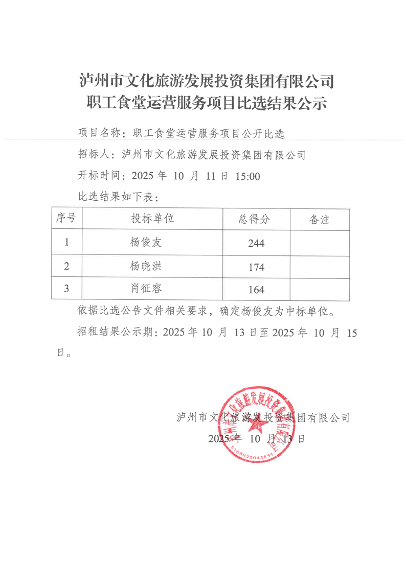 泸州市文化旅游发展投资集团有限公司职工食堂运营服务项目比选结果公示